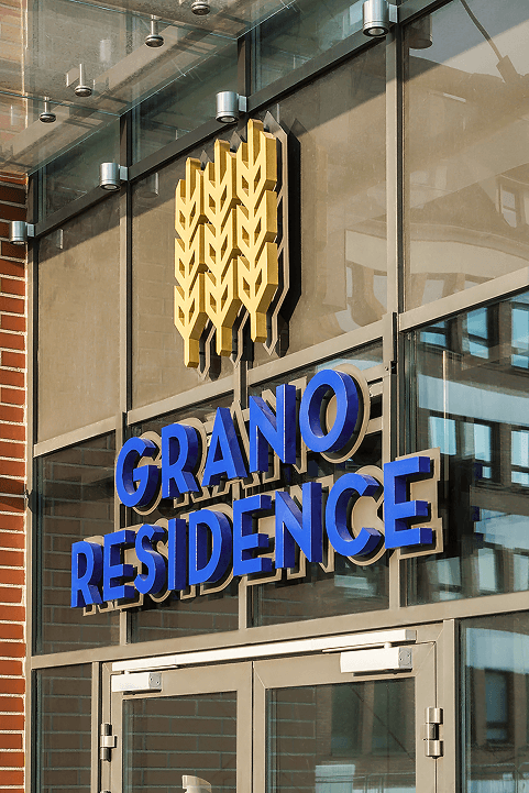 Beleuchtete 3D-Buchstaben in elegantem Blau sowie ein Signet in Form von Ähren unterstreichen den prestigeträchtigen Charakter der Grano Residence. Die moderne und gut lesbare Beschilderung sorgt für eine hohe Sichtbarkeit und fügt sich harmonisch in die Architektur des Gebäudes ein.