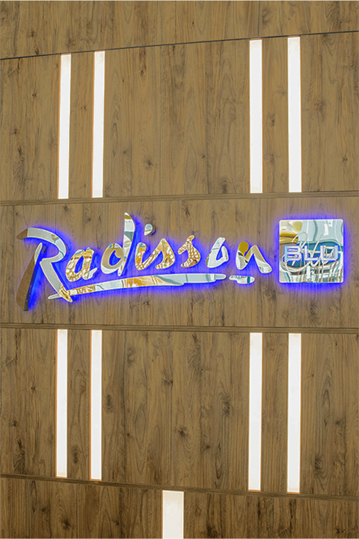 A sleek and minimalist Radisson Blu logo, specially designed for the hotel's entrance. The illuminated letters – “Radisson” in white and “Blu” with a signature blue accent – give the facade a prestigious and distinctive appearance.