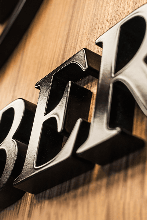 Des lettres noires modernes sur un mur en bois soulignent le caractère prestigieux de l’hôtel. La finition mate et la forme tridimensionnelle rendent le logo non seulement élégant, mais aussi parfaitement visible dès l’entrée.