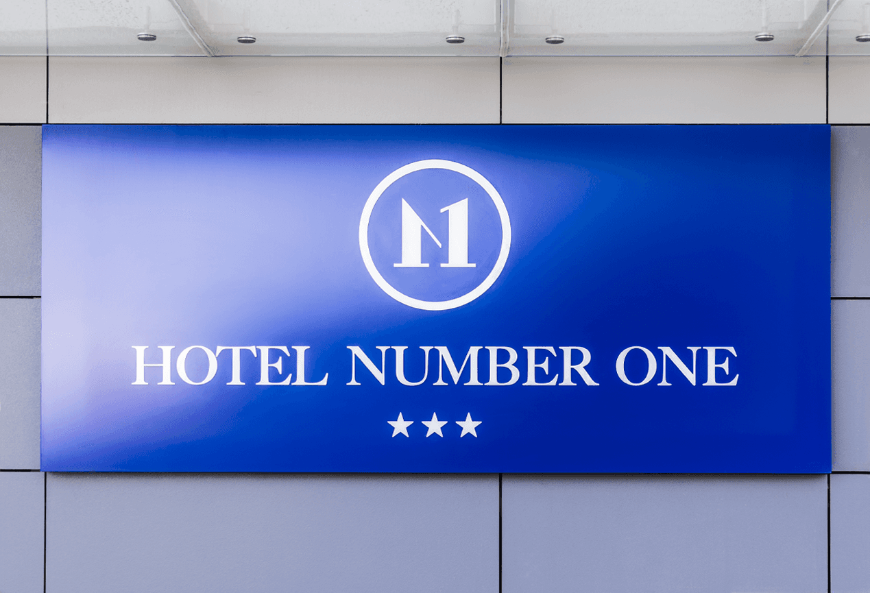 Des lettres blanches rétroéclairées sur un fond bleu marine confèrent à la façade un caractère élégant et prestigieux. La forme moderne et le design minimaliste attirent immédiatement l’attention et soulignent le style exclusif de l’hôtel.