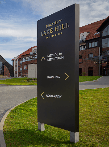 Przestrzenne logo Mazury Lake Hill Resort & Spa, wykonane z akrylu i pokryte złotą szczotkowaną blachą, to elegancki element wizualny, który podkreśla prestiż hotelu. Uzupełnieniem jest nowoczesny pylon wjazdowy z czytelnym oznakowaniem kierunkowym, prowadzącym gości do recepcji, parkingu i aquaparku. Oba elementy doskonale harmonizują z otoczeniem i stanowią wyrazisty punkt orientacyjny dla gości wjeżdżających na teren obiektu.